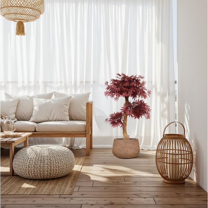 De kunstboom is gemaakt op een robuuste stam van echt hout waarop de 3 bladkronen gemonteerd zijn en is bijzonder goed gevuld. Het blad is natuurgetrouw nagemaakt van de echte Acer in een prachtige diep rode kleur.